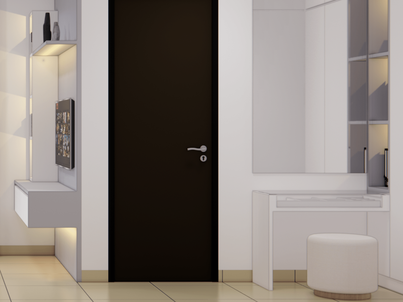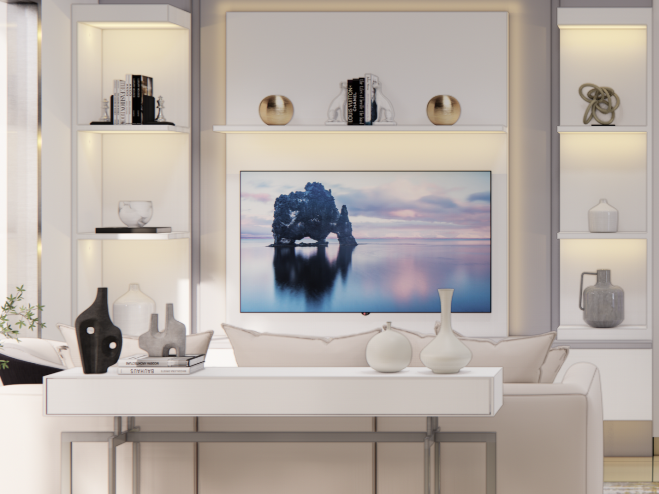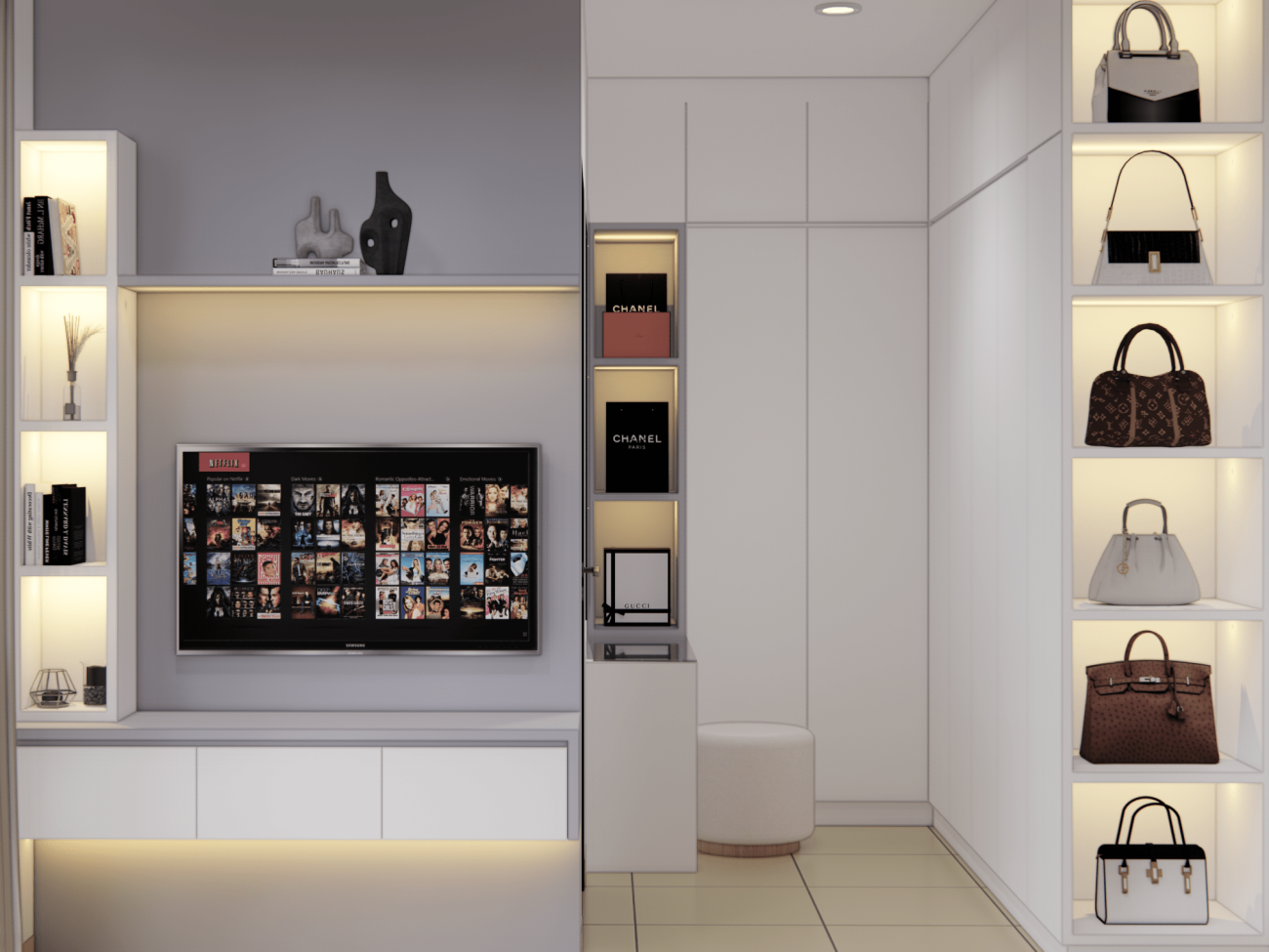 Warna putih memberikan tampilan bersih, elegan dan terang di design interior ini.