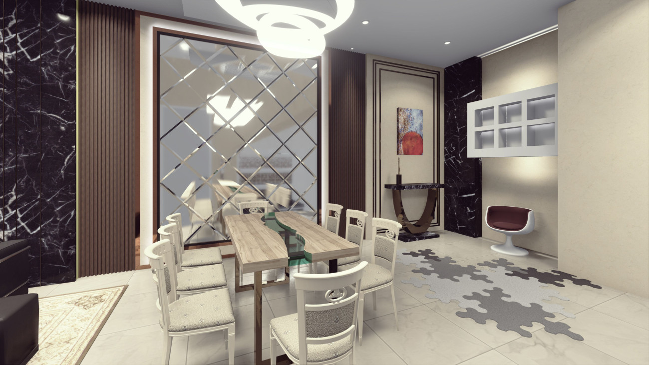 Menggunakan kaca dan batu alam marmer dan granit juga bisa digunakan untuk melapisi dinding atau beberapa furniture, misalnya table top counter di dapur, meja makan, serta coffee table, dengan ini akan membuat interior rumah minimalis mewah terkesan elegan. Pantulan cahaya pada kedua material ini dapat memberikan kesan ruangan yang terang, elegan, dan glamour.