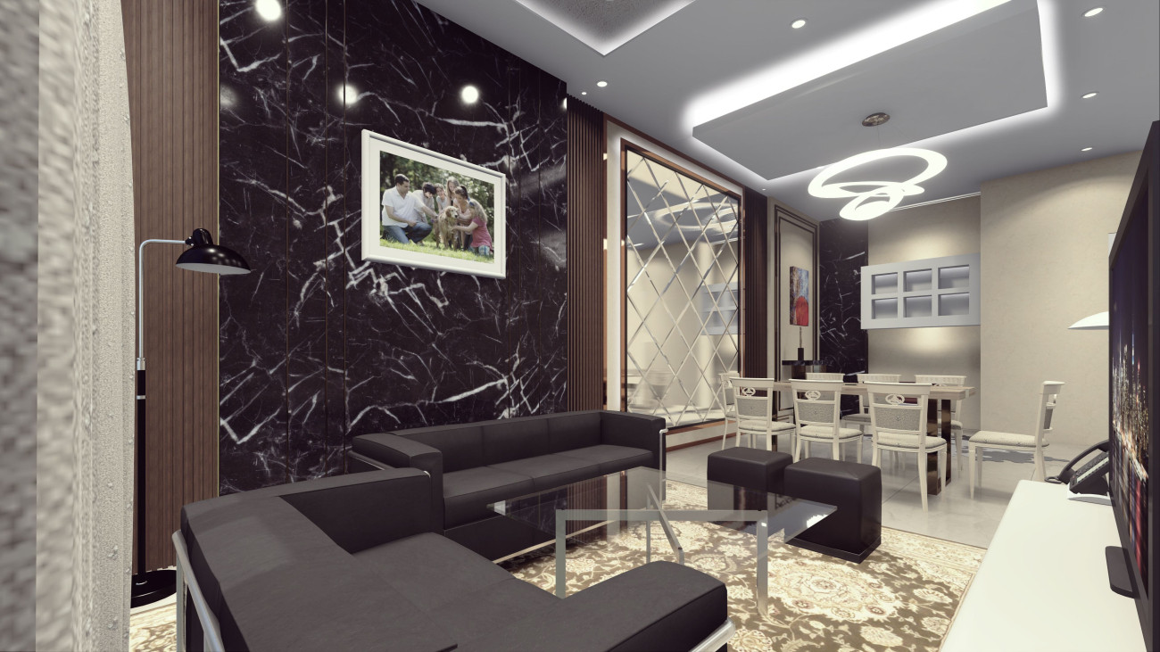 Menggunakan kaca dan batu alam marmer dan granit juga bisa digunakan untuk melapisi dinding atau beberapa furniture, misalnya table top counter di dapur, meja makan, serta coffee table, dengan ini akan membuat interior rumah minimalis mewah terkesan elegan. Pantulan cahaya pada kedua material ini dapat memberikan kesan ruangan yang terang, elegan, dan glamour.